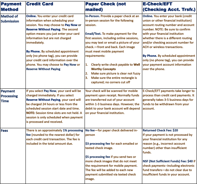 In addition to the information below, please see other important payment details. Available session time slots are subject to change without notice and are only confirmed once payment has been processed and received. To reserve your session, be sure to allow enough time for your method of payment to be received.
